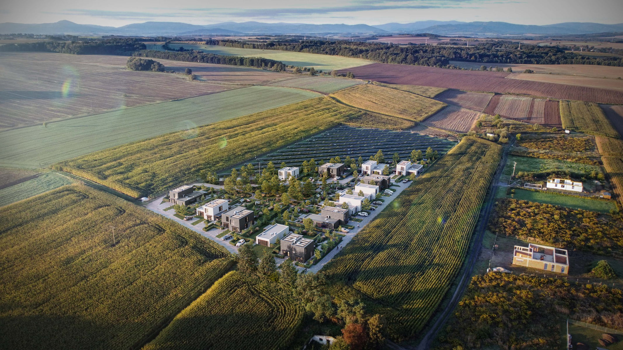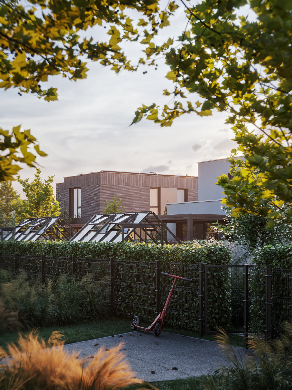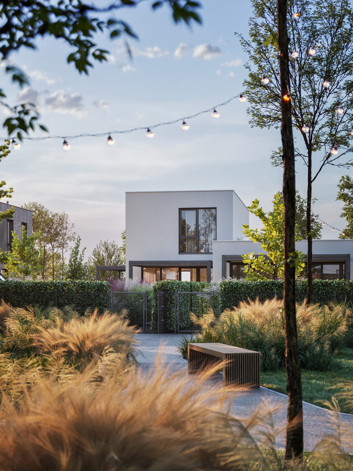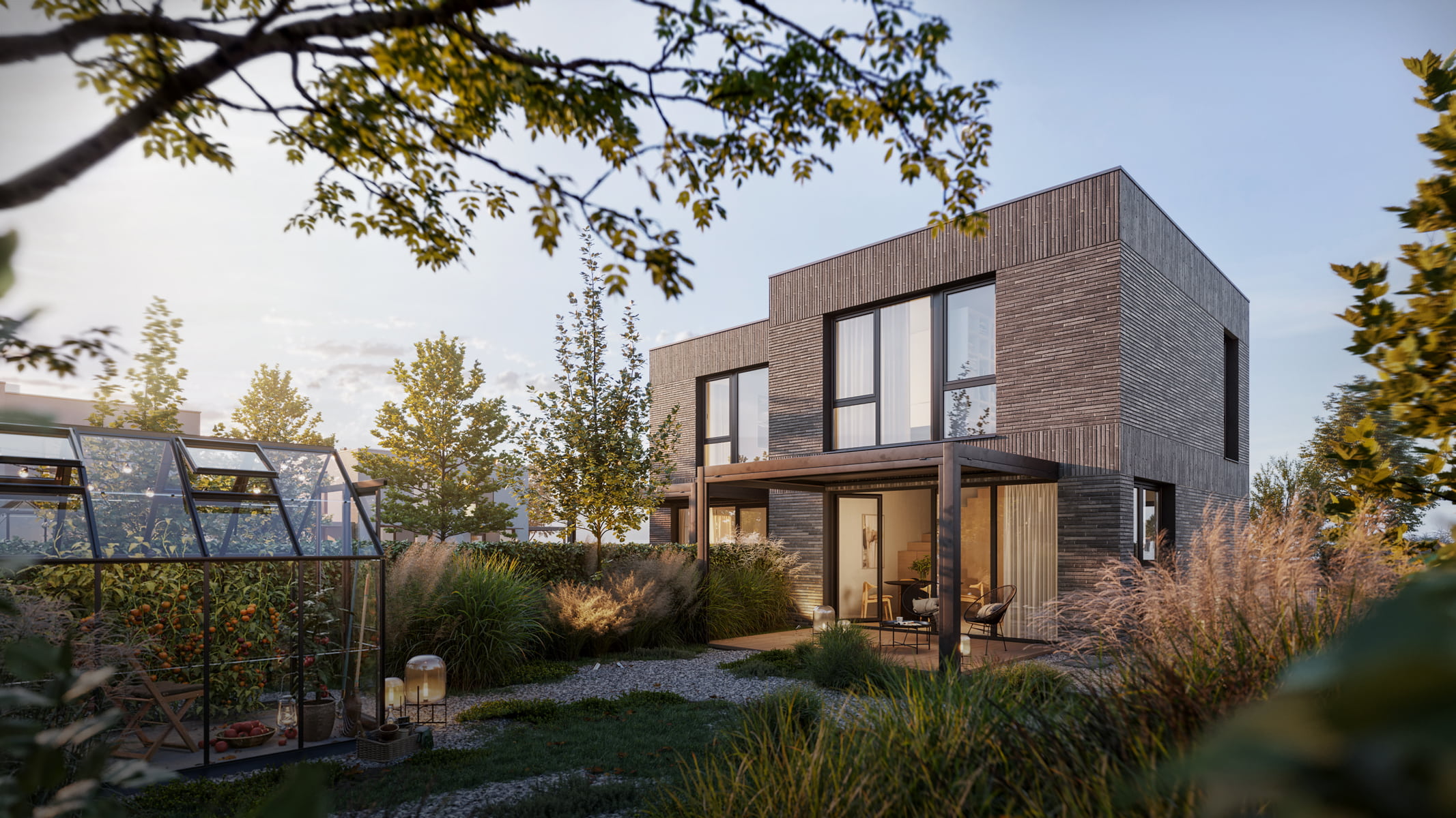 Nowa Niwnica is a modern single-family residential development in Niwnica, near Nysa, Poland — a place I’m personally connected to. This project presents a series of architectural visualizations created to reflect its minimalist architecture, the contrast between elegant gray brick and white plaster and its calm, green surroundings. Private gardens with small greenhouses, as well as pergolas, offer a peaceful retreat from the urban bustle, creating a sense of idyllic charm.